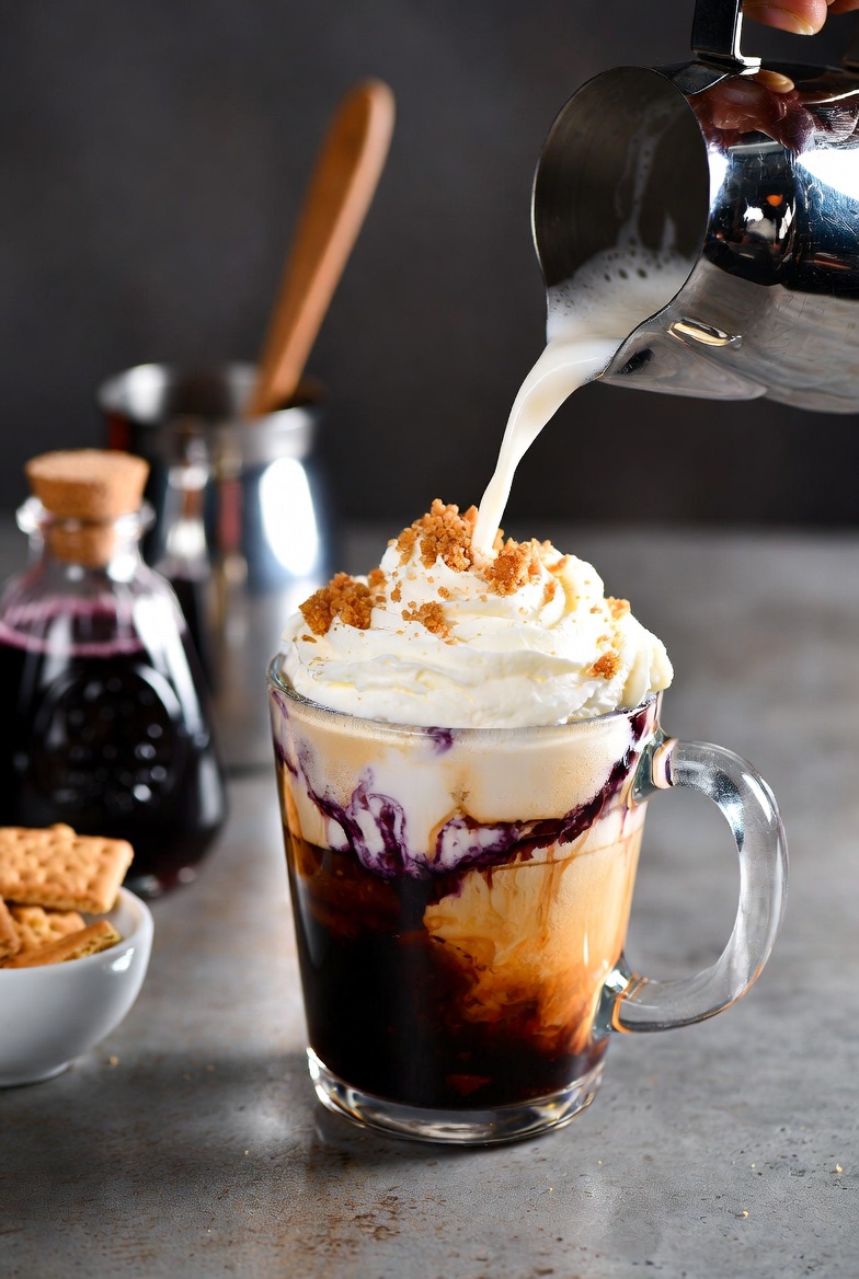 - Assemble the Latte: In a mug, add 2 tablespoons blueberry syrup, the espresso, and the cheesecake mixture. Stir well, then pour in the frothed milk. Top with whipped cream, graham cracker crumbs, and extra blueberries.